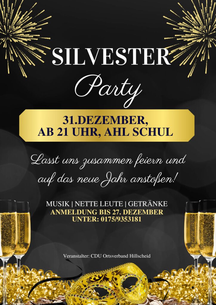 Gemeinsam ins neue Jahr feiern Der CDU-Ortsverband Hillscheid lädt herzlich zur Silvesterparty am 31. Dezember in die Ahl Schul ein. Ab 21 Uhr sind alle Interessierten… Silvesterparty in der Ahl Schul weiterlesen